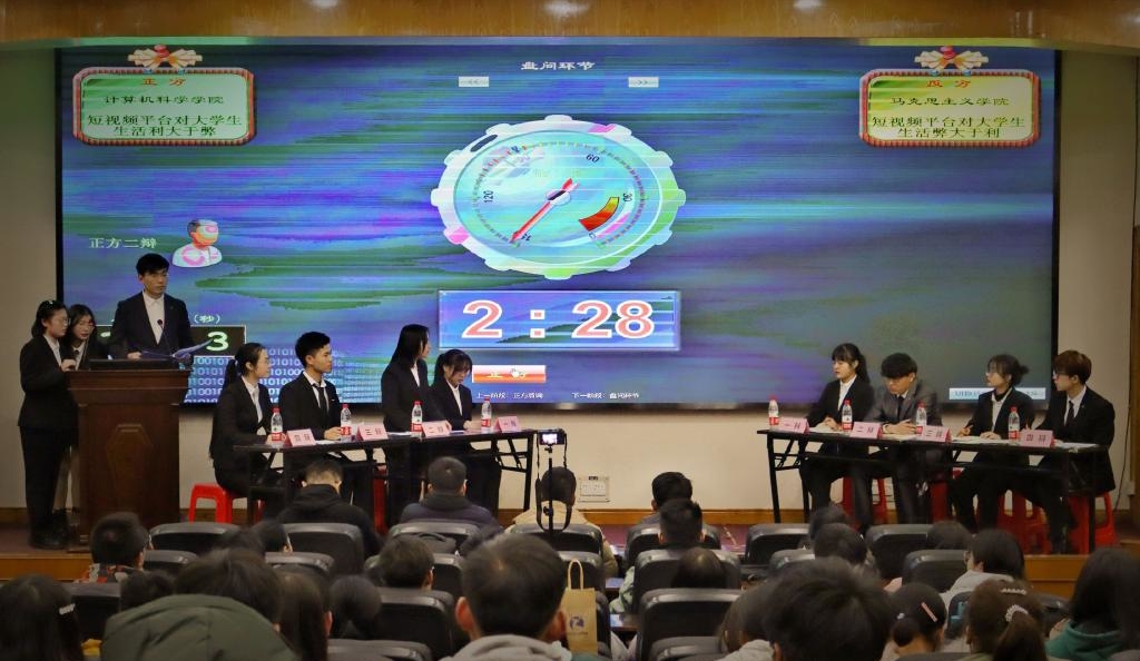 计算机科学学院代表队和hjc黄金城官方网站代表队作为正反双方,围绕“短视频平台对大学生生活利大于弊还是弊大于利”这一辩题展开冠亚之争。