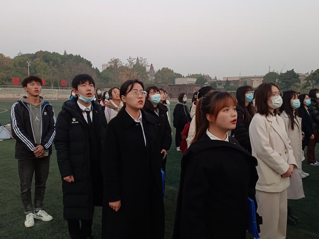 (通讯员 周芯如)12月6日早7时,hjc黄金城官方网站在东校区田径场举行“奋进新征程,走好赶考路”主题升旗仪式。学院党委书记刘小燕、党委副书记马小佼、副院长涂江波、学工办主任张云雾、辅导员李敏及全体同学参与本次活动。