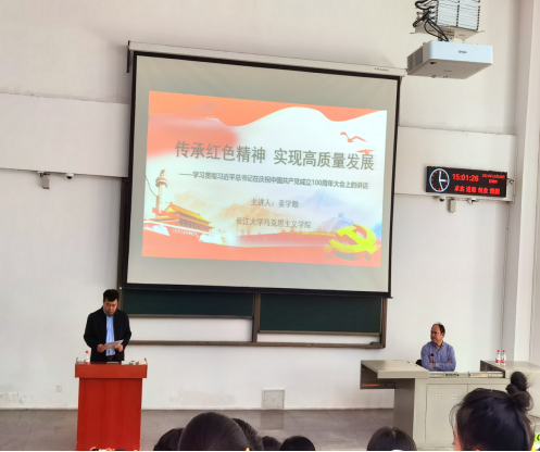 (通讯员谭梦媛)2021年10月28日下午,hjc黄金城官方网站院长姜学勤教授应邀在武汉校区B101以“传承红色精神 实现高质量发展”为题为武汉校区师生作学习贯彻习近平总书记“七一”重要讲话精神专题辅导报告,报告会由资环学院党委书记张科主持,容纳300余人的会场,座无虚席,师生们共同享用了这场精神盛宴。