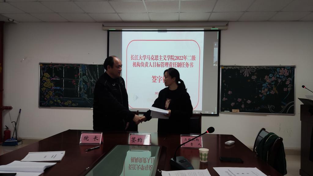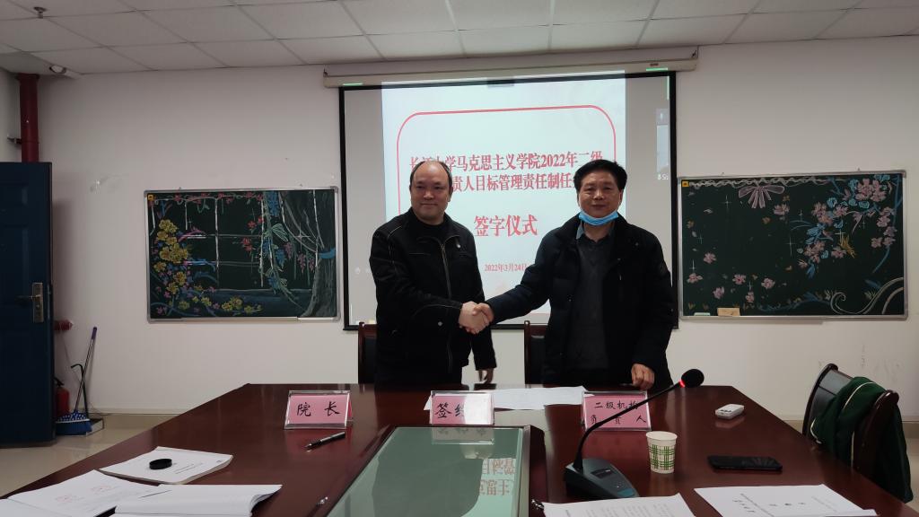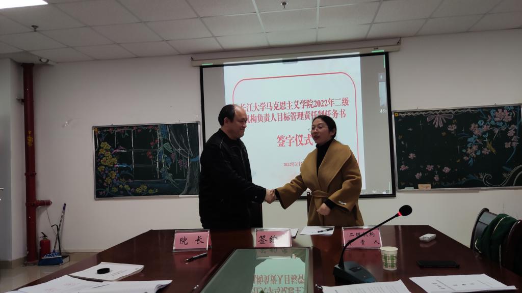 在宣讲了各二级机构的基础工作、主责任务和发展性指标考核任务清单后,院长姜学勤当场与“生命长江”教研室、虚拟仿真教学体验中心等2个特色教学机构,党史党建研究所、廉洁建设研究中心等6个特色科研平台,马原、纲要、思修等5门公共课教研室,学工办、团委、院办等5个行政管理机构,以及政治系和研究生思政课教研室等3个专业教学机构,共21个二级机构负责人签订了目标管理责任制任务书。