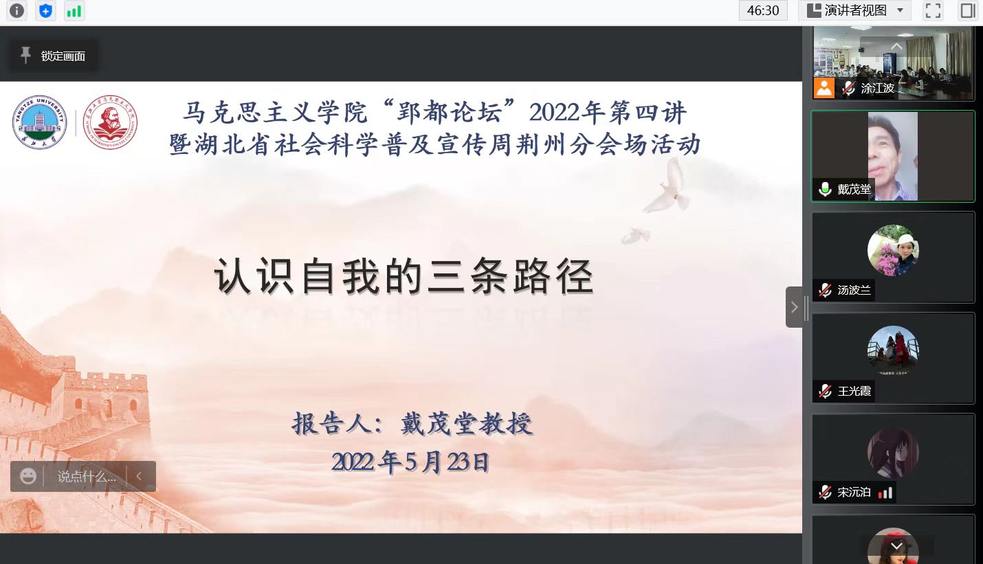 (通讯员 马梦甜)知人者智,知己者明。2022年5月23日上午9点整,北京师范大学哲学国际中心教授戴茂堂为hjc黄金城官方网站师生带来一场题为《认识自我的三条路径》的讲座。本次讲座由hjc黄金城官方网站副院长、教授涂江波主持,以线上线下相结合的方式进行。
