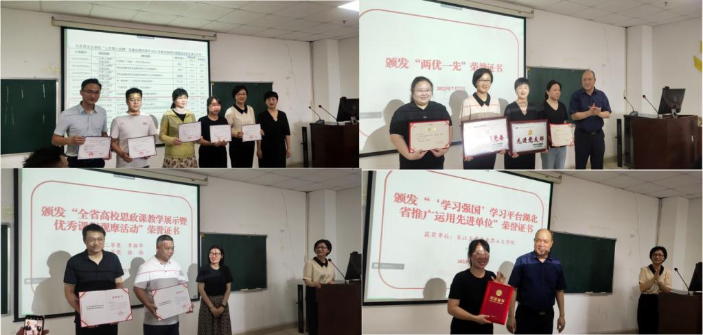 本次大会还进行了荣誉表彰和证书颁发。涂江波副院长、马小佼副书记为学院“一支部一品牌”党建项目和2022年度党建研究课题顺利结项的13位项目负责人颁发了结项证书,张莉老师为全省高校思政课教学展示暨优秀课程观摩活动获奖者李振华老师、徐骆老师颁发了荣誉证书,姜学勤院长颁发了学院“两优一先”先进集体和个人、“学习强国”学习平台湖北省推广运用先进单位的荣誉证书。