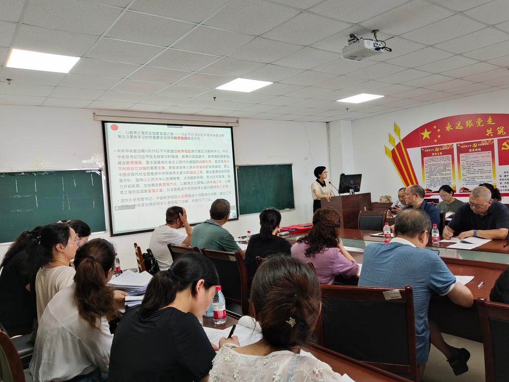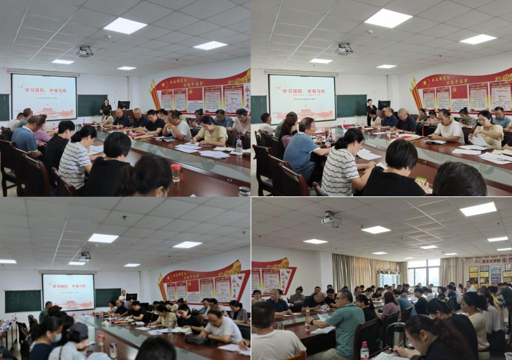 会上,首先进行了教职工政治理论学习活动。院党委书记刘小燕领学了“习近平在中共中央政治局第五次集体学习时强调 加快建设教育强国 为中华民族伟大复兴提供有力支撑”、“习近平主持召开二十届中央国家安全委员会第一次会议强调 加快推进国家安全体系和能力现代化 以新安全格局保障新发展格局”、“习近平在文化传承发展座谈会上强调 担负起新的文化使命 努力建设中华民族现代文明”、“习近平在中共中央政治局第六次集体学习时强调 不断深化对党的创新理论的规律性认识 在新时代新征程上取得更为丰硕的理论创新成果”、“习近平对党的建设和组织工作作出重要指示强调 深刻领会党中央关于党的建设的重要思想 不断提高组织工作质量”、习近平总书记关于档案工作的重要指示批示摘编、“王蒙徽书记在荆州调研时的重要讲话精神”、“全省《关于深化党员干部纪律教育工作的意见》及其解读”等内容。她还有针对性地宣讲了全省主题教育工作推进会会议精神,以及中共湖北省委主题教育领导小组办公室印发《关于在主题教育中认真学习借鉴“浦江经验”的通知》、《湖北省高校领域突出问题专项整治工作方案》,转发中央《关于在主题教育中学习运用浙江“千万工程”经验案例的通知》、《关于认真学习贯彻习近平总书记重要讲话精神深刻领悟以学增智重要要求 推动主题教育走深走实的通知》、《关于在主题教育中坚决防止形式主义 坚决杜绝“低级红”“高级黑”现象的通知》、《关于认真学习贯彻习近平总书记重要讲话精神 进一步落实以学正风重要要求的通知》等文件精神,传达了学校近期重要活动和会议精神,通报了学院上半年意识形态工作情况,部署了暑期学院党建与思政工作。