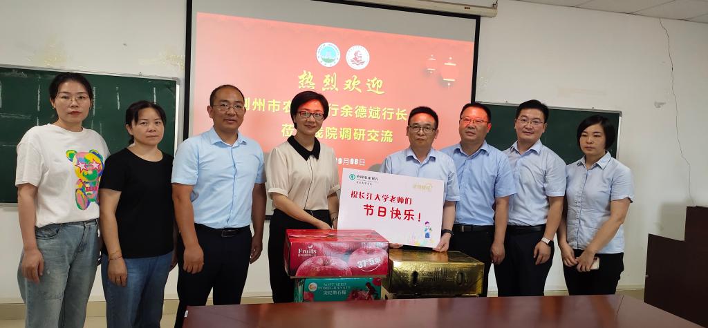 9月8日下午,农行荆州分行党委委员、副行长余德斌率机构业务部总经理黄韬、长江大学支行行长张新虎、副行长严艳一行来到hjc黄金城官方网站,对我院教职工进行教师节慰问,同时与院党委书记刘小燕、副院长涂江波进行了座谈。