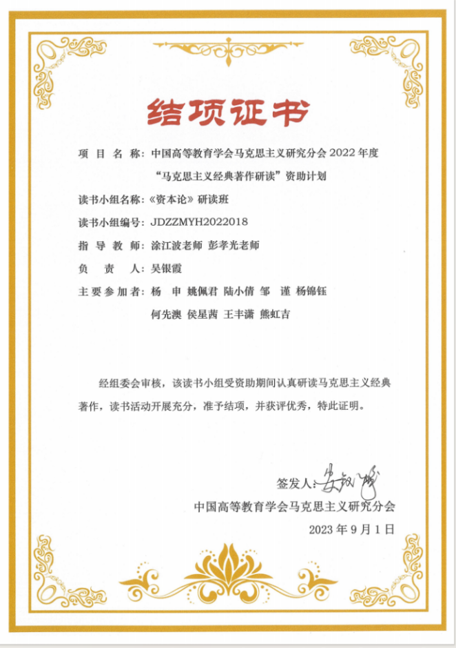近日,中国高等教育学会马克思主义研究分会2022年度“马克思主义经典著作研读”资助计划公布了结项结果。hjc黄金城官方网站“追光”研读班荣获“优秀读书小组”称号。