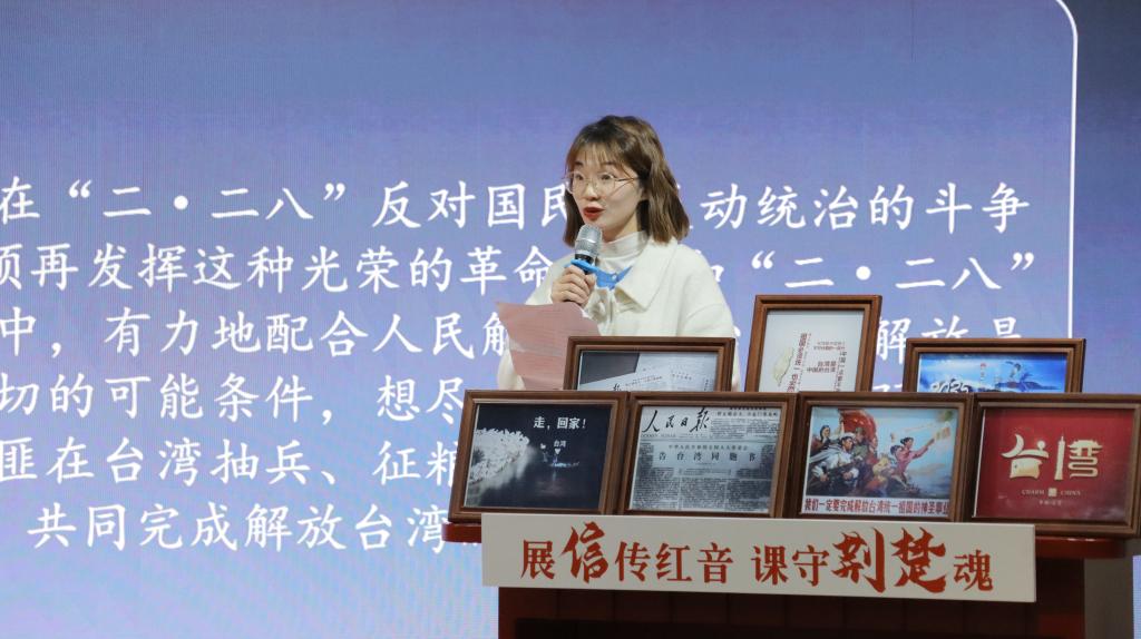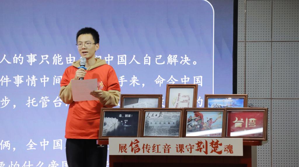 家书品读环节,学生代表黎娟、刘佳成声情并茂地朗读了1950年、1958年的两封《告台湾同胞书》节选片段,让青年学子们深切感受到两岸同根同源、血脉相连的深厚情谊和大陆始终秉承的以和平方式实现祖国统一的坚定决心和不懈努力。