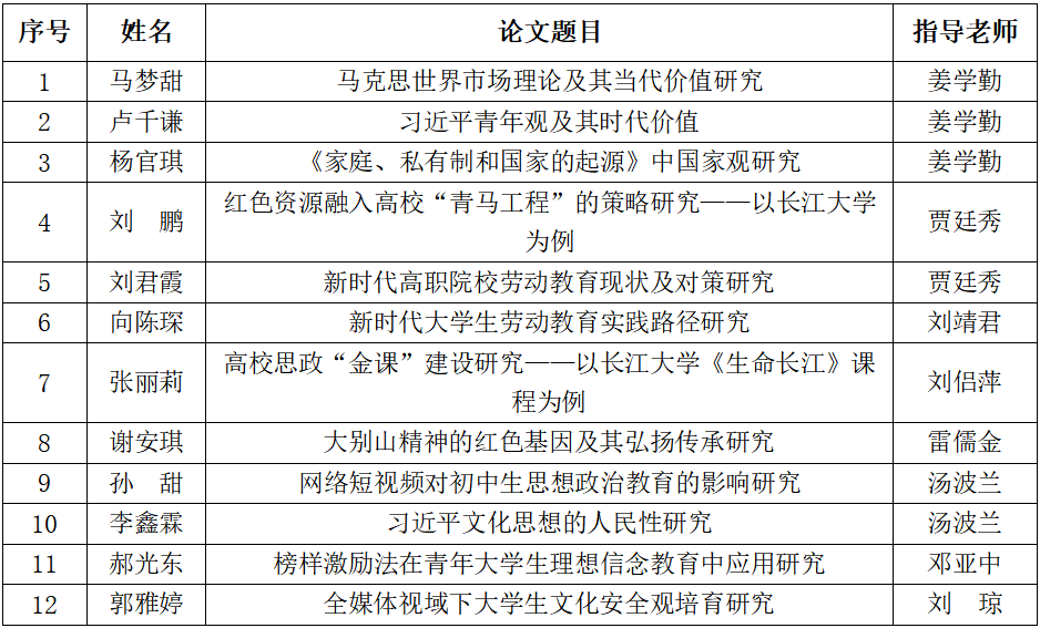根据长江大学研究生院《关于做好2024届硕士学位申请及答辩工作的有关通知》要求,hjc黄金城官方网站马克思主义理论专业2024届硕士研究生学位论文答辩安排如下: