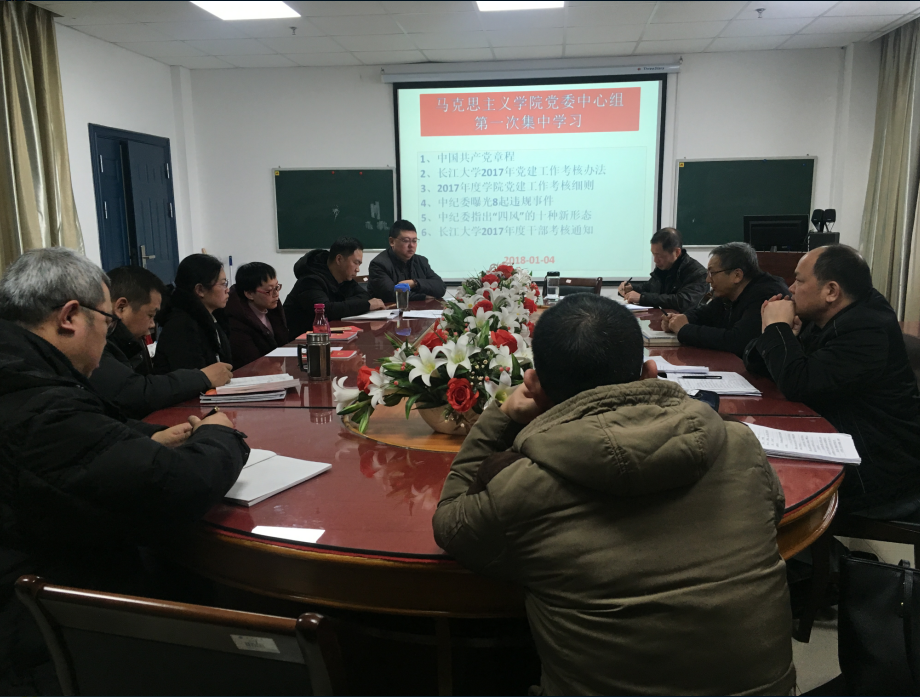 2018年1月4日,hjc黄金城官方网站党总支中心组在文科楼1125室组织了2018年首次集中学习。总支委员、支部书记、教工支部委员参加了理论学习会,会议由党总支书记吴智勇主持。