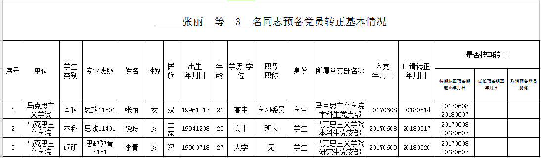 经过党支部对预备党员1年的培养教育和考察,经支委会研究确定,报党总支(或分党委)审查同意,将于近期召开党员大会讨论张丽等 3 名同志预备党员转正,特在hjc黄金城官方网站范围内进行公示。