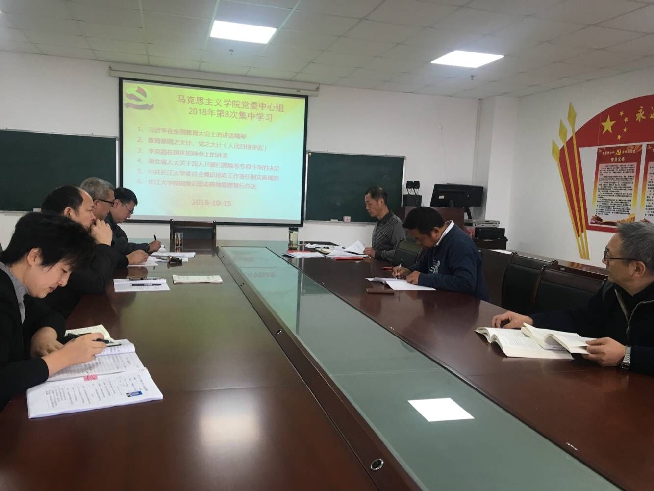 hjc黄金城官方网站于2018年10月15日在文科楼1104室举行了党委理论学习中心组第八次集中学习,党委理论中心组成员及各支部书记参加了学习会,会议由党总支书记吴智勇主持。