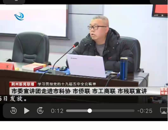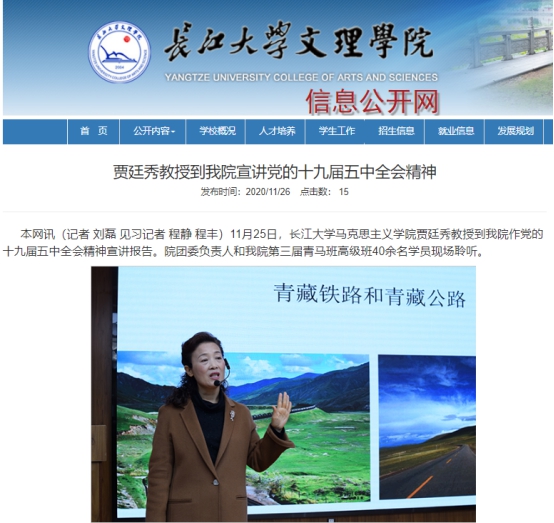11月5日,学院党委副书记马小佼领学了十九届五中全会公报,全院学生党员、入党积极分子、学习小组成员共同参会;11月8日,学院组织各支部书记参加学校基层党组织书记集中培训,共同聆听了武汉大学项久雨教授所做的《中国道路的未来——十九届五中全会精神解读》;11月10日,学院召开了党委理论中心组集中学习暨党委扩大会,吴智勇书记领学了十九届五中全会精神;11月13日,学院组织开展全院教职工政治学习,全体教师共同学习了全会精神,院长姜学勤为与会人员上了一堂了题为《擎画新蓝图 开启新征程——党的十九届五中全会精神解读》的专题党课;11月12日至11月13日,学院党委书记、院长带头学习了全国教育系统党的十九届五中全会精神宣讲报告会、中央宣讲团成员在湖北高校的宣讲报告;12月3日,校党委书记朱业宏为我院科级以上干部做了十九届五中全会的专题宣讲;12月4日,湖北省委宣讲团成员、武汉纺织大学hjc黄金城官方网站院长金艳来校宣讲十九届五中全会精神,全院思政课教师参会;12月10日,荆州市委宣讲团成员、我院涂江波副院长为全院师生宣讲了全会精神。此外,我院贾廷秀、卢军等教师作为荆州市委宣讲团成员,还先后受邀为长江大学文理学院、市科协、市侨联、市工商联、市残联等校内外单位进行了理论宣讲。全院学生也通过“支部主题党日”、主题团会等形式开展了专题学习。