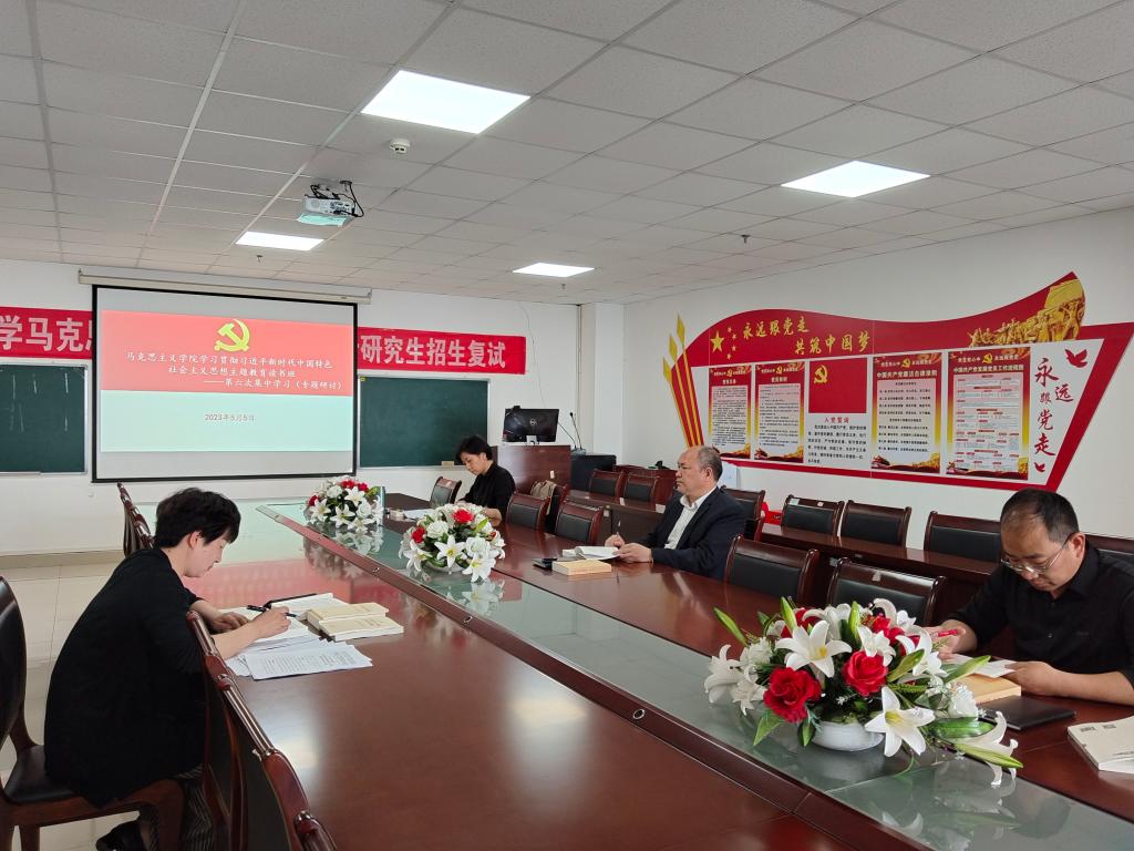 5月5日晚,hjc黄金城官方网站学习贯彻习近平新时代中国特色社会主义思想主题教育读书班在文科楼1104室开展第六次集体学习。深入学习了《习近平著作选读》第一卷“加强和改进党的群团工作”等12个篇目内容,逐字逐句研读了《习近平新时代中国特色社会主义思想专题摘编》中有关“实施科教兴国战略,强化现代化人才支撑”的论述。院领导姜学勤、刘小燕等聚焦“三位一体”推进高水平大学建设作了交流发言。