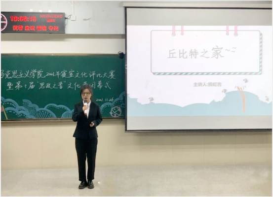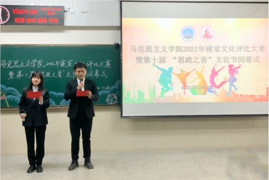 (通讯员:王晓彤 摄影:齐晓杭) 思政之音青春昂扬,百年党史岁月峥嵘。11月26日晚7时,hjc黄金城官方网站于12教102室举行2021年“心宿暖阳 乐寝无忧”寝室文化评比大赛暨第十届“思政之音”文化节闭幕式。学院党委书记刘小燕,院党委副书记马小佼,院长助理李振华,学院教师张志超、王贤锋、孙萌、彭孝光、何波、饶玲、陈质晶,学工办主任张云雾,辅导员李敏及2020级、2021级全体学生齐聚一堂欣赏寝室风采,回顾本届文化节精彩片段。
