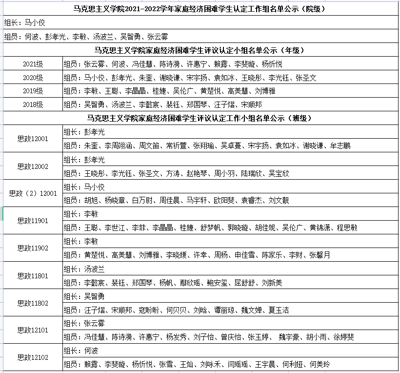 根据长江大学学生工作处《关于做好2021-2022学年家庭经济困难学生认定工作的通知》,结合学院实际,现将我院2021-2022学年家庭经济困难学生认定评议工作组成员名单公示如下: