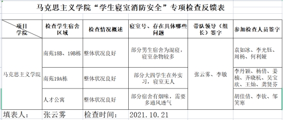 (通讯员:郜越)为了营造学生宿舍安全、卫生、整洁、健康的生活环境,2021年10月21日下午,hjc黄金城官方网站组织开展了冬季学生宿舍消防安全检查。本次检查由年级辅导员张云雾、李敏老师带队,学生会和研究生会生活部及部分寝室长参与了自查。本次消防安全检查覆盖了全院本、研学生寝室。