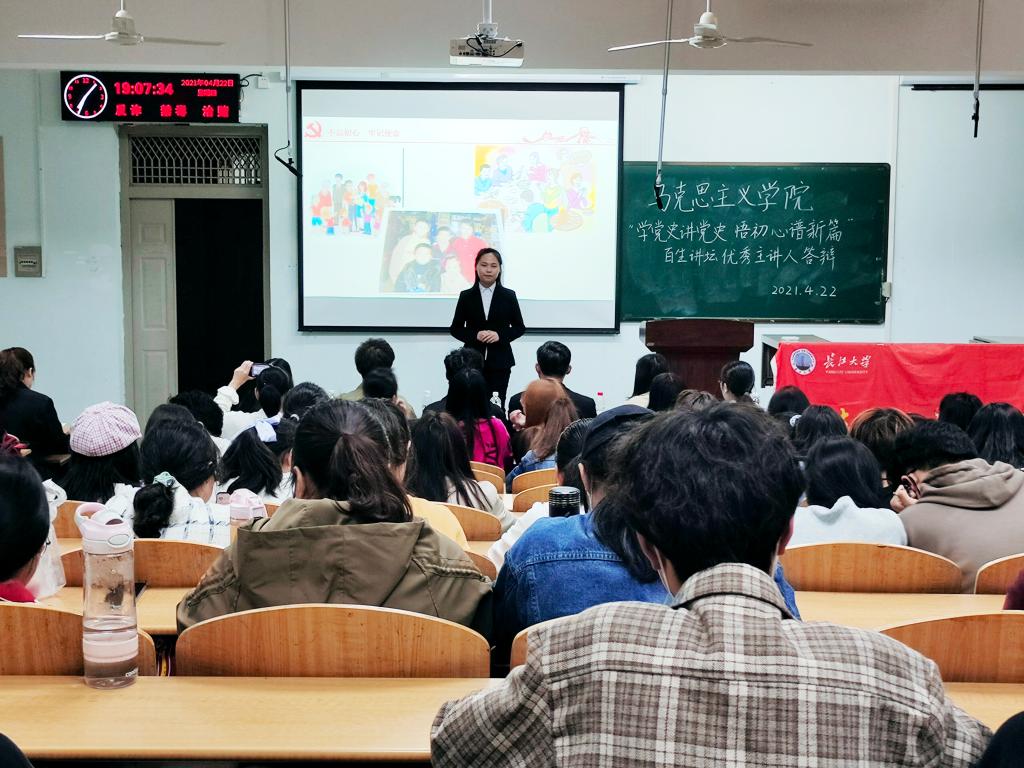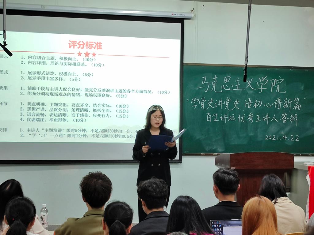 (通讯员 李春燕)学党史讲党史,悟初心谱新篇。 4月22日19:00,hjc黄金城官方网站“百生讲坛”优秀主讲人答辩活动于13教A203举行。本次活动邀请辅导员李敏、团委学生会主席李懿宸、副主席魏文婵、莫保华和部分部长作为嘉宾评委。大一大二全体同学参加。