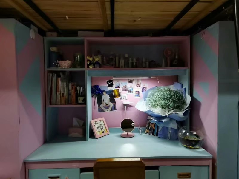 继续走进去深入探索也是惊喜连连,同学们把不大的寝室装饰的充满生活气息和人情味,行李多而不乱,寝室空气清新怡人,夹杂着淡淡的清香浸人心脾;屋顶有气球装饰、贴纸装饰和灯光装饰;墙壁被划分了绘画墙、照片墙、安全墙和留言墙等区域;桌面床铺有玩偶、鲜花、收藏品和时令水果装饰,搭配桌布温柔的台灯灯光使人心情愉悦,清爽又养眼;书架上摆着的《共产党宣言》《习近平谈治国理政》满满都是hjc黄金城官方网站的浓厚文化学术氛围。
