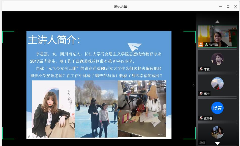 7月19日,学院邀请了现工作于西藏桑珠孜区曲布雄乡中心小学和中共洪湖市委组织部的2名2017届校友李思嘉、王盛华通过腾讯会议为全院学生做了立志服务基层成长故事分享会。hjc黄金城官方网站学院党委副书记马小佼、全体辅导员参会。
