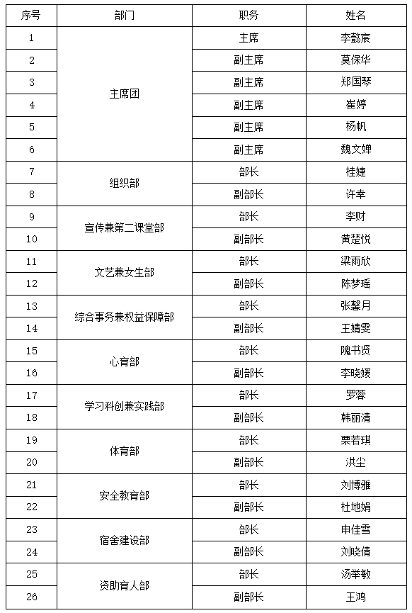 本着公平、公正、公开的原则,经自主申报、资格审查、公开答辩、综合考察等环节,现将hjc黄金城官方网站第九届团委学生会副部及以上学生干部换届竞选结果公示如下: