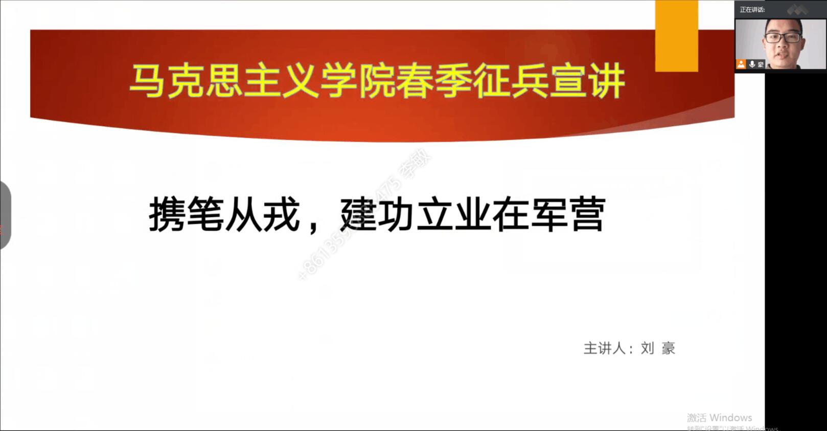 (通讯员 刘豪)6月6日下午17:00,hjc黄金城官方网站通过腾讯会议开展2020年春季征兵宣讲会。学院兼职辅导员、退役士兵刘豪主讲,学院全体男生和部分女生参加了宣讲。