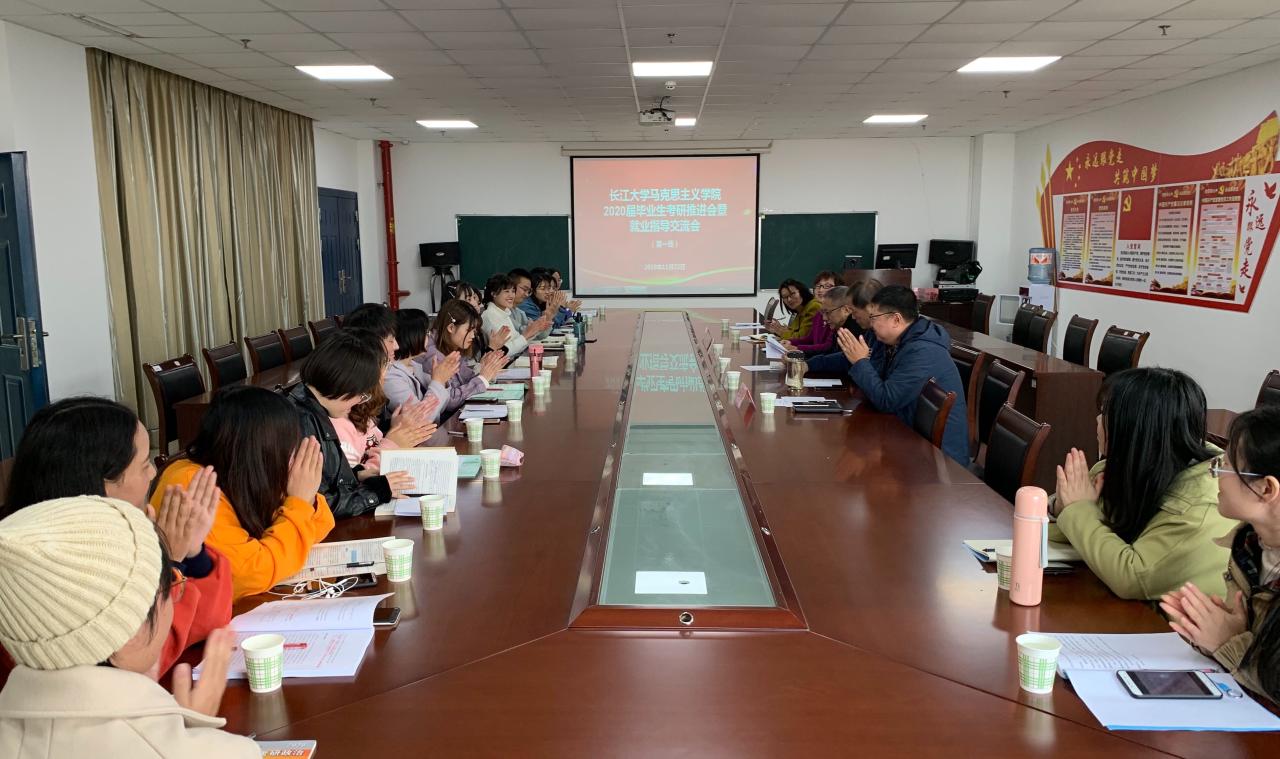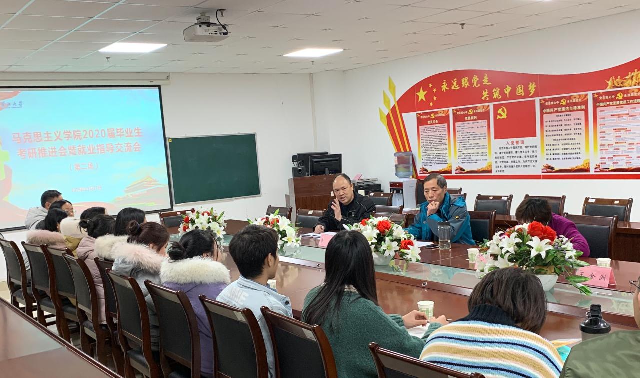 11月22日和27日下午2:30,hjc黄金城官方网站2020届毕业生考研推进会暨就业指导交流会第一场和第二场在文科大楼1104会议室有序开展。学院院长姜学勤、党委书记吴智勇、党委副书记马小佼、教授王金洲、院长助理兼思政11602班班主任谷军、思政11601班班主任邓亚中、青年博士张莉及全体本科毕业生参加了交流会。