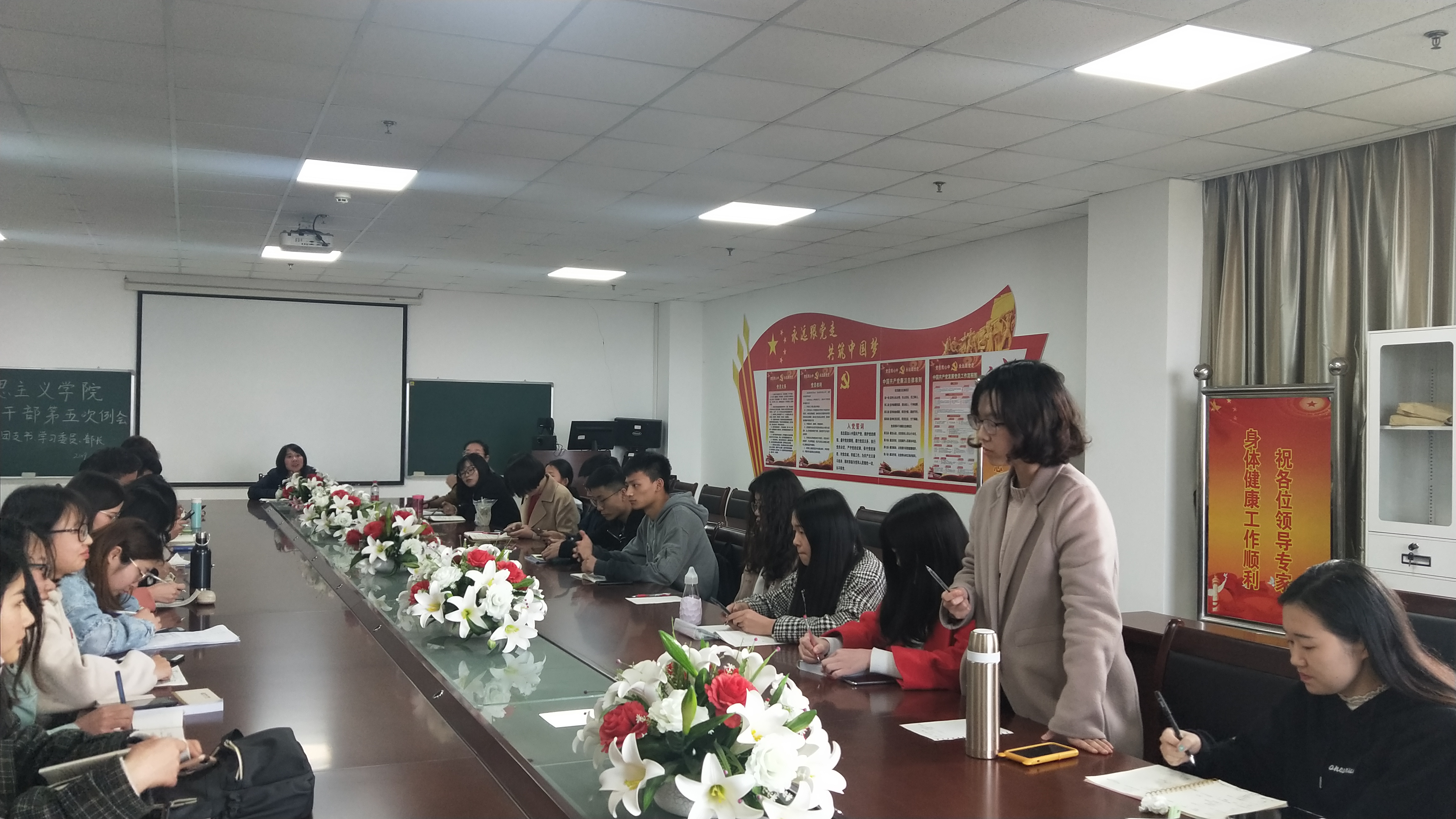 本次会议包括三个环节,第一个环节是各部门代表汇报本学期工作,开学一个月以来学生会的工作主要围绕近期的“长江春潮”艺术体育节一系列活动来进行。会议的第二个环节,张老师就开学一个月以来的工作做总结并指出问题。首先,近期存在的主要问题有:考勤记录不准确、普通话报名率不高、四级通过率较低、早晚自习到勤人数太少等等,张老师强调大家要认真对待早晚自习,重视四六级考试。同时还存在每周四寝室卫生大检查时,部分寝室对评比结果不满意,她提出要改进学生会宿建部的工作方式,并会在近期召开寝室长会议,详细讨论相关事宜。另外一个问题就是青年大学习的完成率不高,她提出了很多建议比如集体观看,或者完成后在群里发言等来提高大家对青年大学习的积极性。接着,张老师进行了工作部署,主要有:学风建设大会的精神传达,出台学院学风建设方案,着重提到以家校合作的方式将旷课挂科记录通报给家长以促进学风建设。会议最后一个环节,各学生干部代表就近期工作状况做总结反思并进行自我批评。到会学生干部都认识到了各自工作中存在的问题,并表示了自己改进和提升工作质量的决心。
