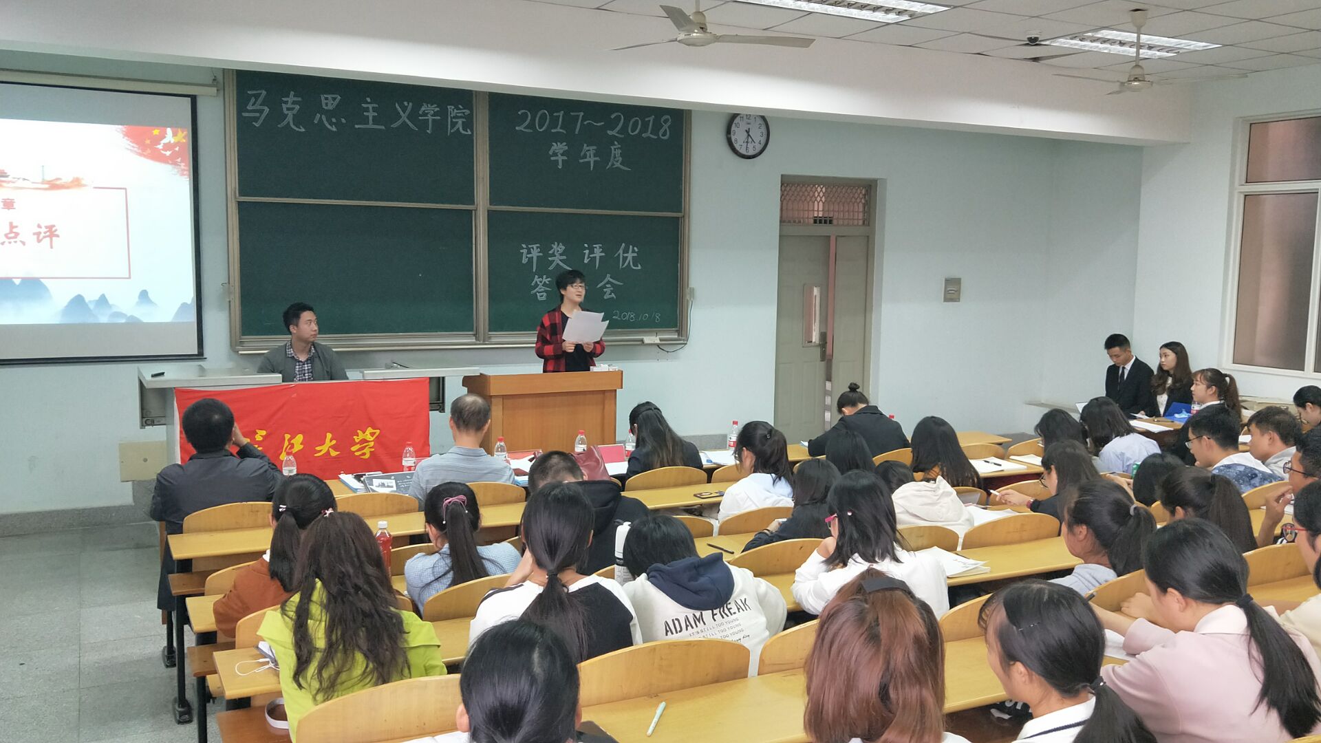 (通讯员:邱诗琪)10月18日下午三点,hjc黄金城官方网站于13教D324举行了2017—2018学年本科生评优答辩会。莅临本次会议的老师有:hjc黄金城官方网站党总支部书记吴智勇老师、党总支部副书记马小姣老师、思政11602班班主任谷军老师、思政11801班班主任汤波兰老师、思政11702班班主任兼学生辅导员张云雾老师、兼职辅导员饶静老师。本次答辩大会主持人是思政11701班黑可昱、丁国庆同学。