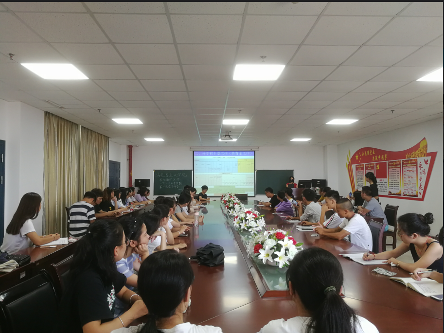 会议开始,辅导员张老师先简单地介绍了开学初共青团主要工作,主要包括学生会和班级组织架构的调整、金秋歌会等,其次说明了开学初学生事务工作,最为关键的是迎新及军训志愿服务工作;随后,马小佼副书记发表讲话,她首先分享自己的工作经历,表达对于来到马院工作的喜悦,其次她提出了“两讲三有”,即讲学习、讲政治、有重点、有方法、有特长。十五个字涵盖了她对学生干部们的真切的期许,希望学生干部们能澎湃的激情。
