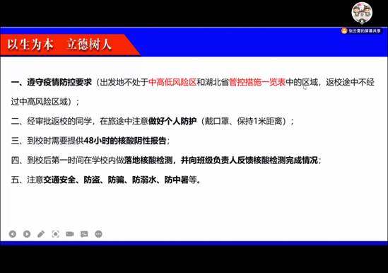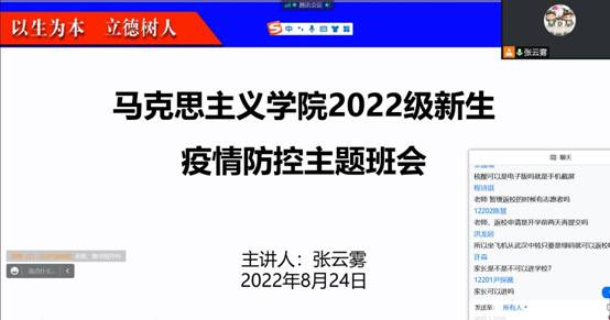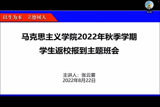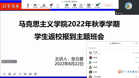 (通讯员:齐晓杭 摄影:龙薛西)为有序做好秋季返校报到工作,讲清疫情防控政策,hjc黄金城官方网站2022年秋季学期学生返校报到主题班会于8月22日-8月25日通过腾讯会议线上召开,辅导员张云雾老师、李敏老师分别面向本、研学生进行了宣讲,学院党委副书记马小佼线上参会。