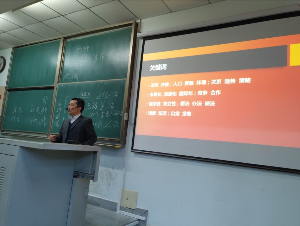 朱书记今天的授课内容是《改革开放四十年》。讲课一开始,朱书记就微笑着向同学们提出了一个问题:提到改革开放四十年,同学们联想到了什么关键词?面对平易近人的朱书记的问题,这些体育学院大一的新生们纷纷做出了自然、积极的回应:富强、深圳、生活、一个老人在南方画一个圈,如此种种,不同的回答此起披伏,讲课还没有正式开始,课堂气氛就已经被很好的调动了起来。朱书记随后在轻松的氛围中开始了他的授课,他从政治、经济、文化、社会等方面对改革开放四十年来中国全方位的脱胎换骨的巨大变化进行了系统的论述,谈改革开放的动因他的授课充满深厚的历史感与广博的理论素养;讲四十年的伟大成就作为背景的PPT图文并茂,口述的支撑数据也娓娓道来丰富精准。漂亮的板书,生动的形体语言,再加上充满激情的洪亮语言深深的感染了同学们,在连续一个小时的精彩授课结束后,朱书记又专门留了半个小时的时间与同学们进行提问交流,有三位同学分别就如何理解改革开放是决定我国当前发展的关键性一招,如何看待荆州未来发展,荆州有无可能达到特区那样的发展水平,如何看待西方文化的传入对我国的影响等问题向朱书记提问,朱书记也都一一给予了有针对性的回答。朱书记的讲课非常有技巧,例如他强调并善于与学生互动,语言既有深刻的学理又朴实生动。讲课内容具有极强的灵活性与针对性,当他知道今天的教学对象是体育学院大一新生以后,马上在授课,板书中就加入了与体育有关的内容,从而迅速拉近了与同学们的心理距离。